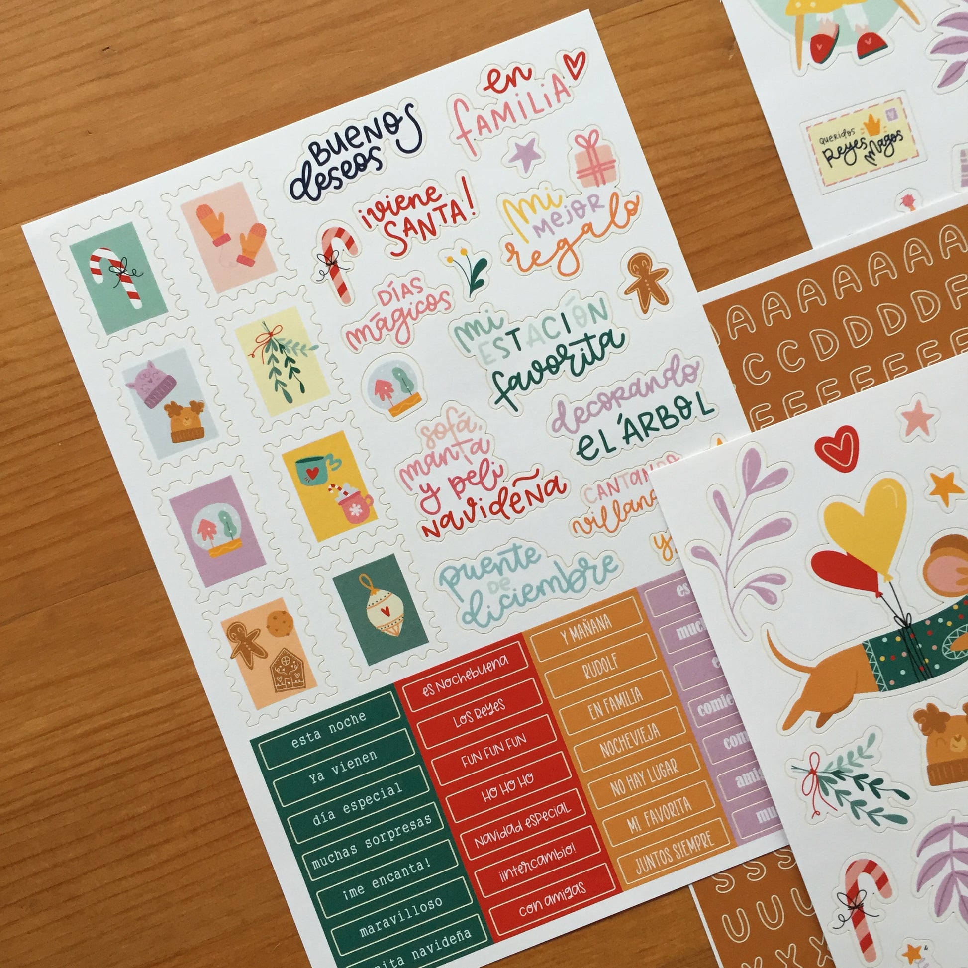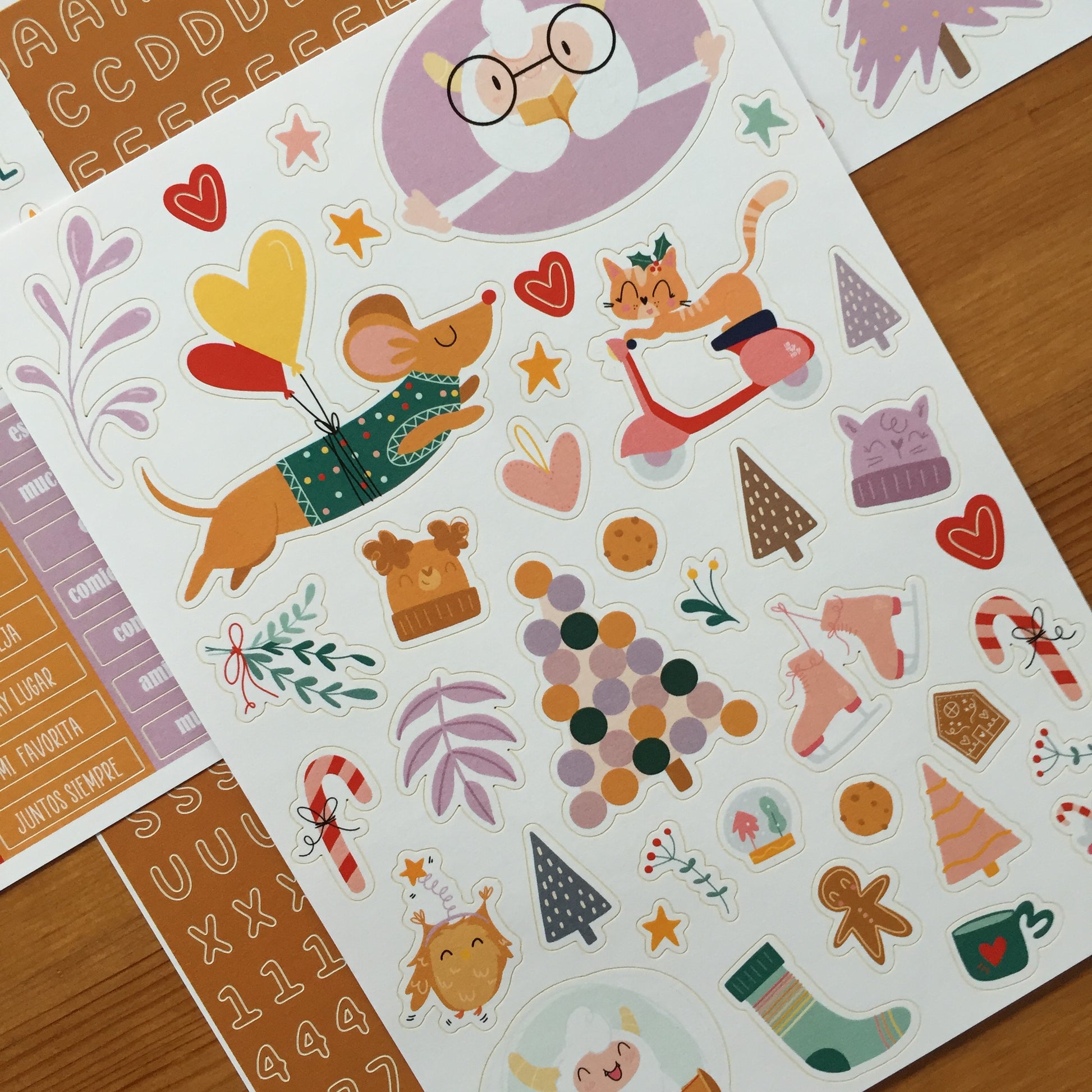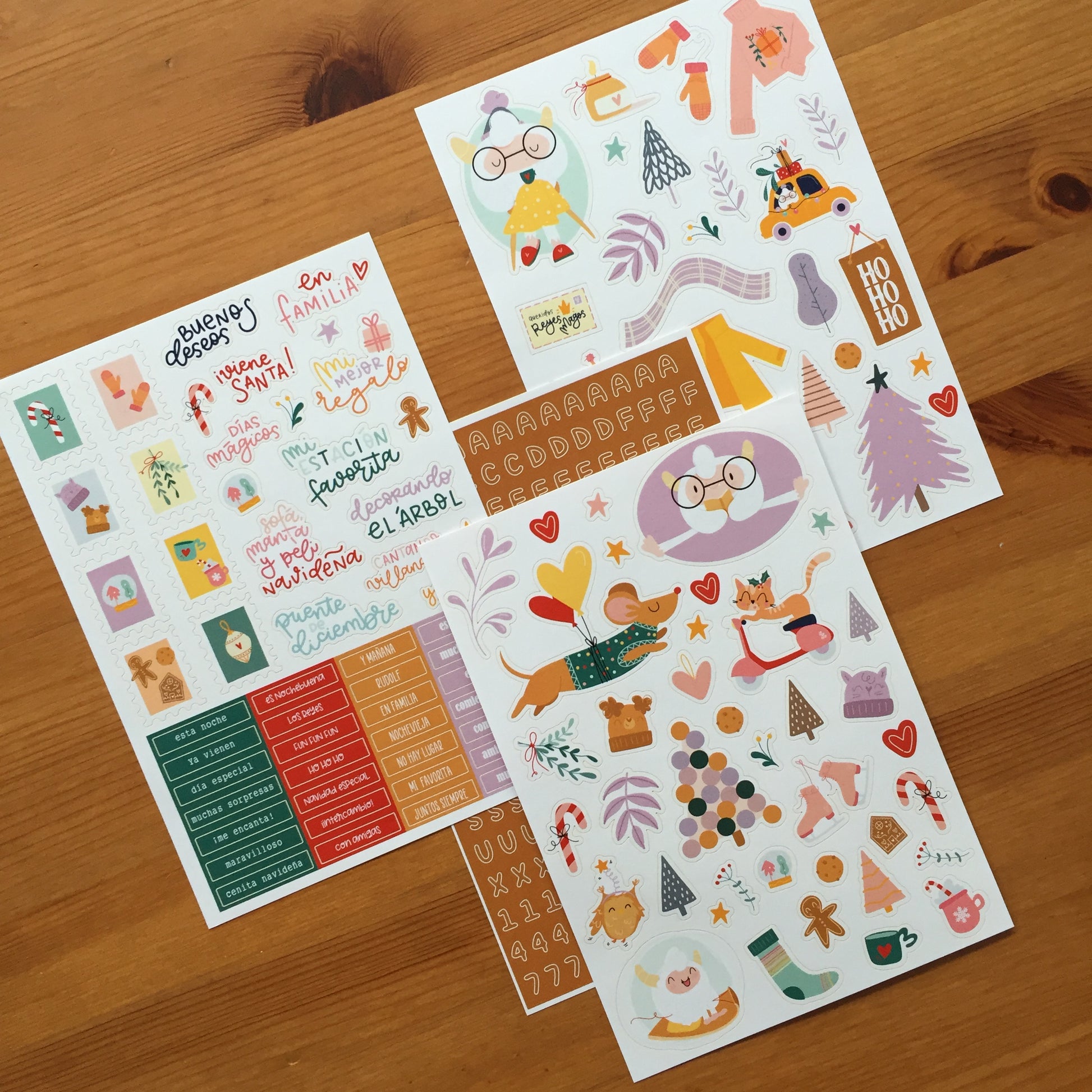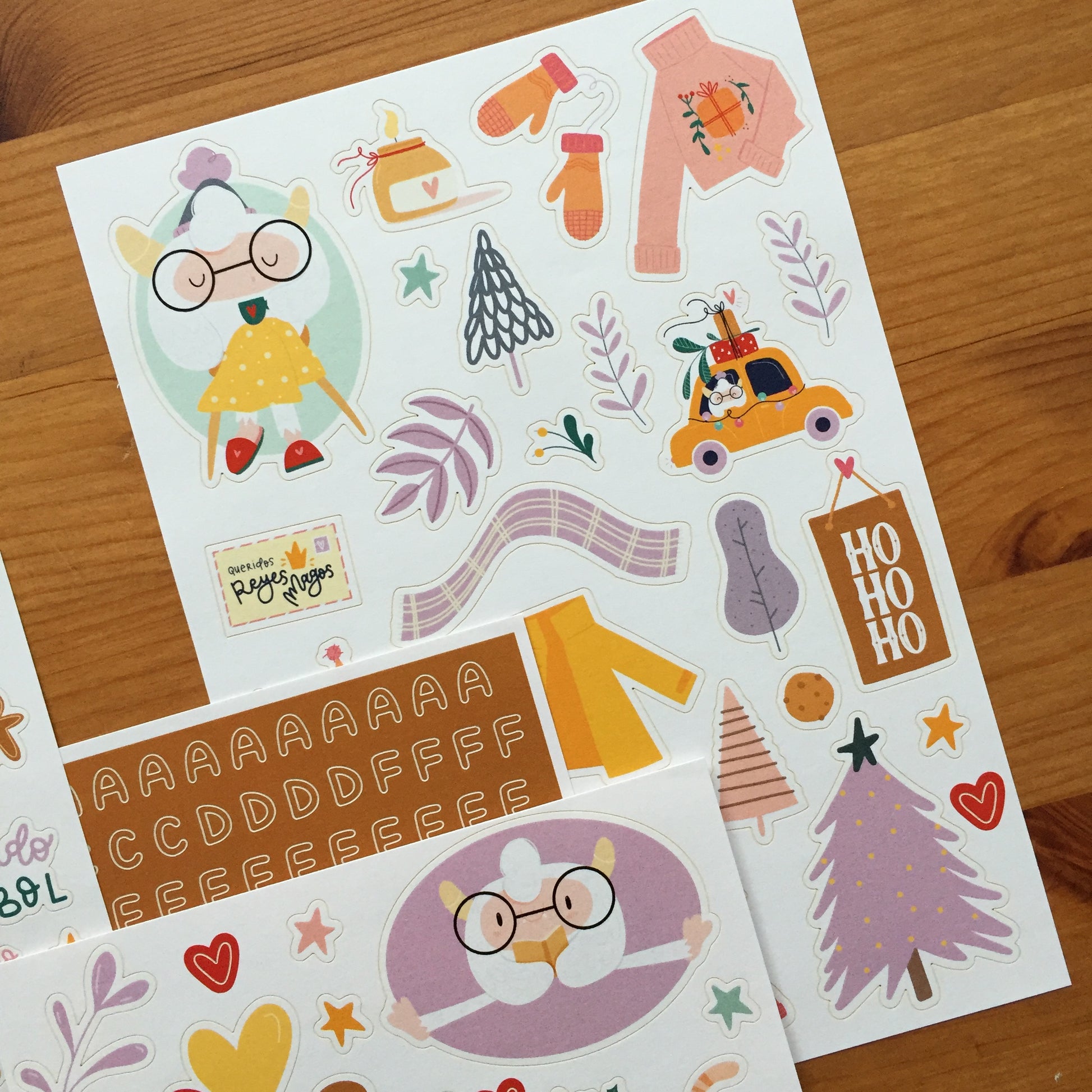 Este pack contiene 4 páginas adhesivas tamaño dinA5; dos de ellas con dibujos, una con palabras y frases y la última con un mini abecedario.