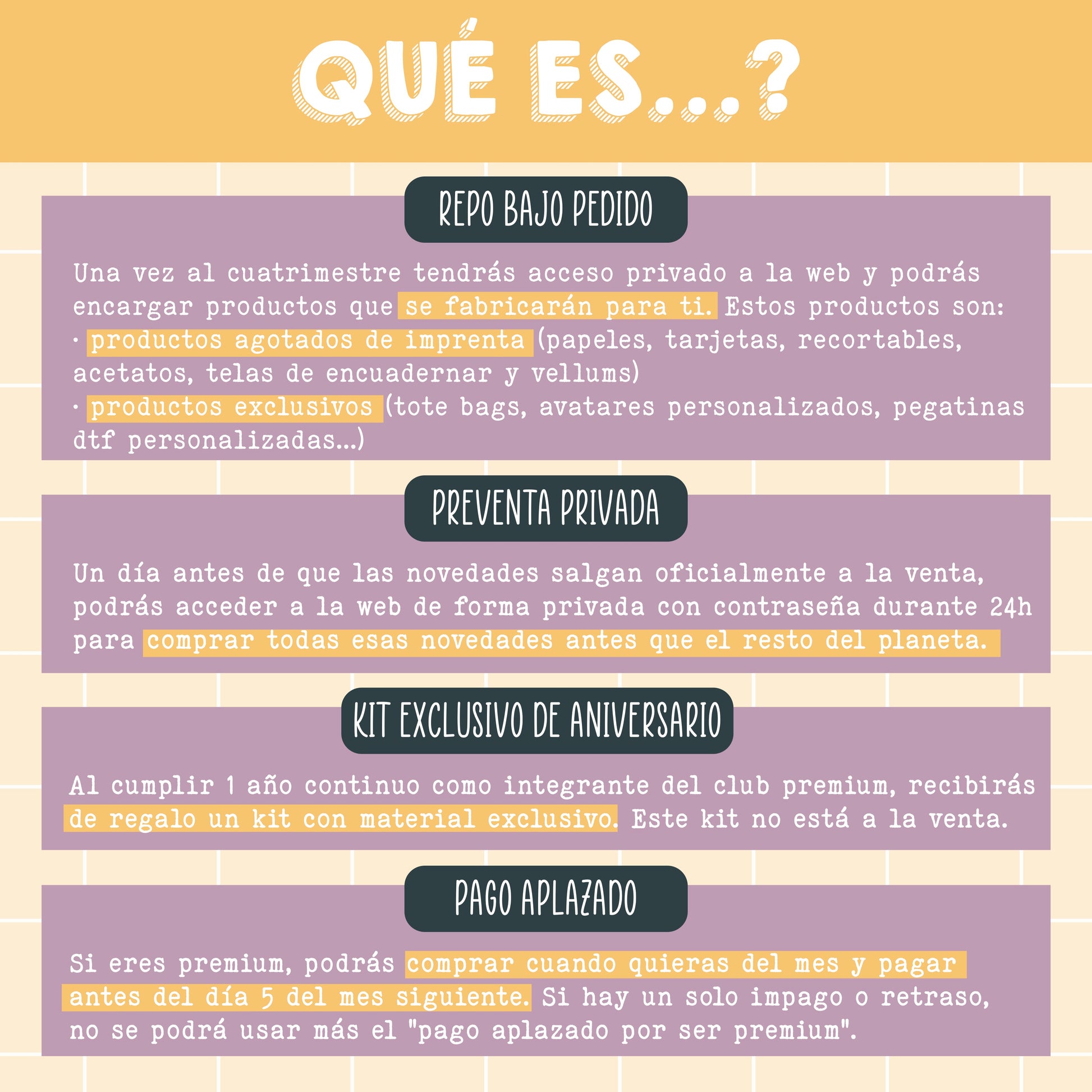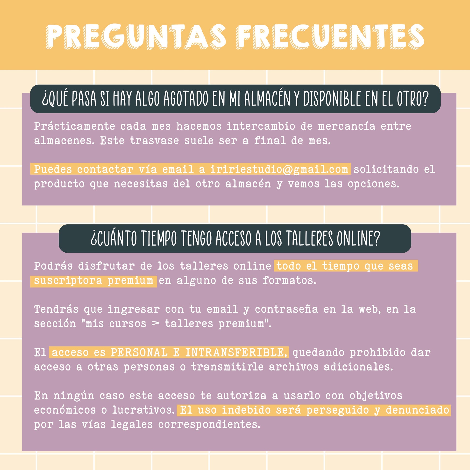 - 1 repo bajo pedido al cuatrimestre (donde podrás pedir cualquier colección Iriri de imprenta como papeles, recortables, tarjetas, vitelas, telas o acetatos y se fabricarán para ti)