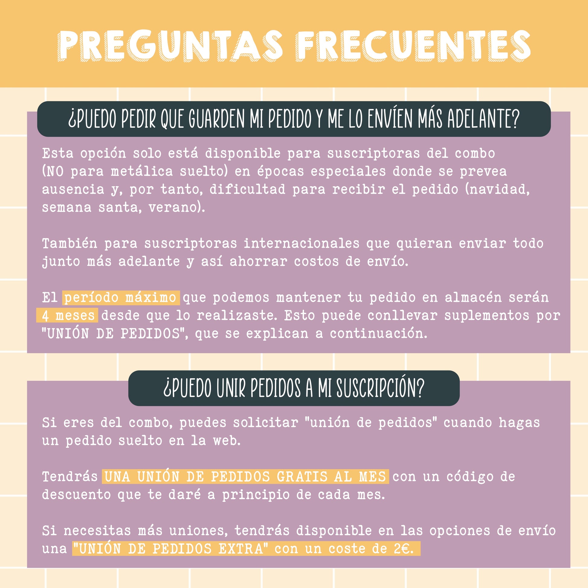 - 1 unión de pedidos gratis al mes (con un código que te dará a principio de cada mes y caduca el último día del mes). Podrás usar "uniones extras" por 2€ que tendrás en los métodos de envío