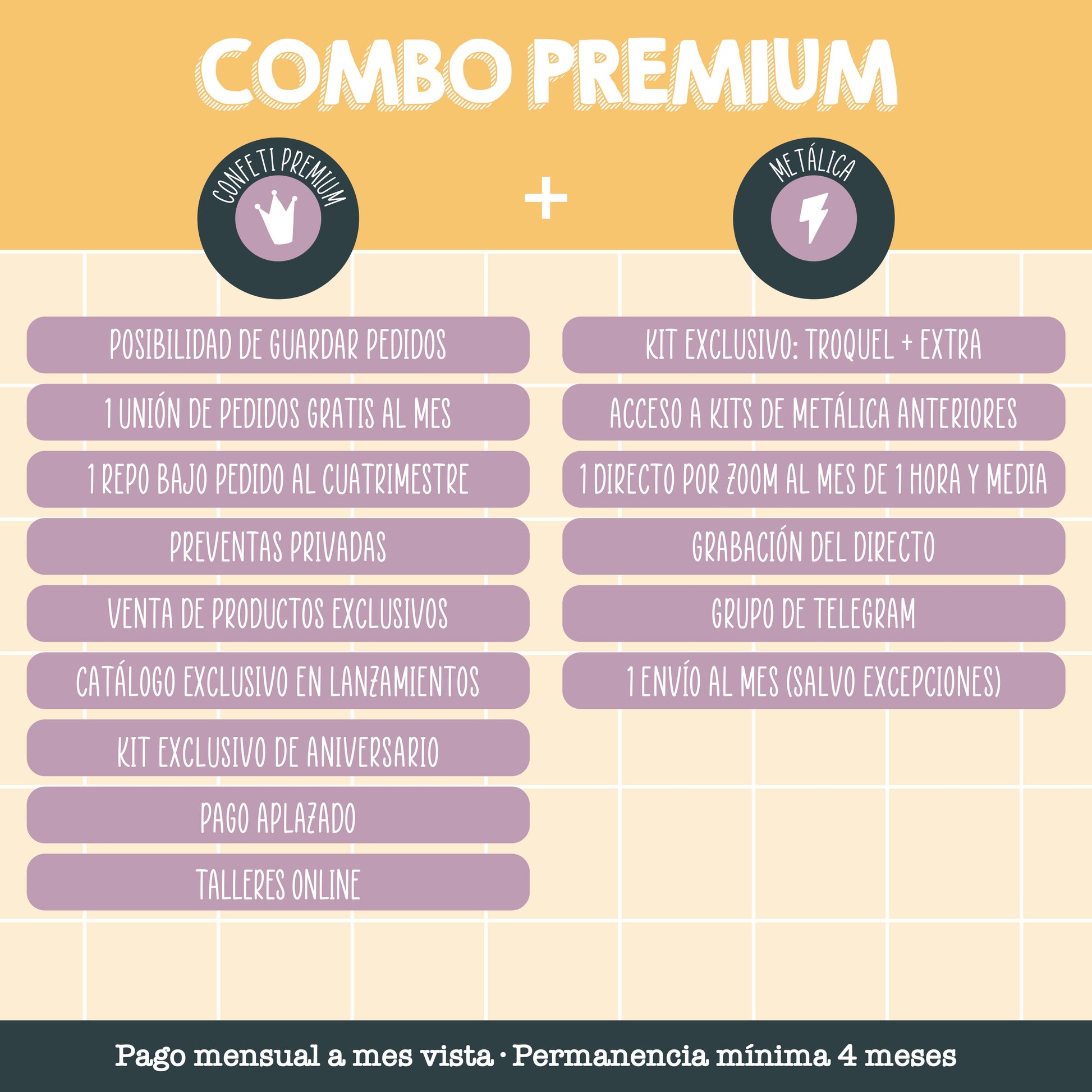 Este es un combo donde recibirás mensualmente (durante 4 meses) tu suscripción Metálica (troquel + extra) y además tendrás todo lo que incluye el club Confeti premium.