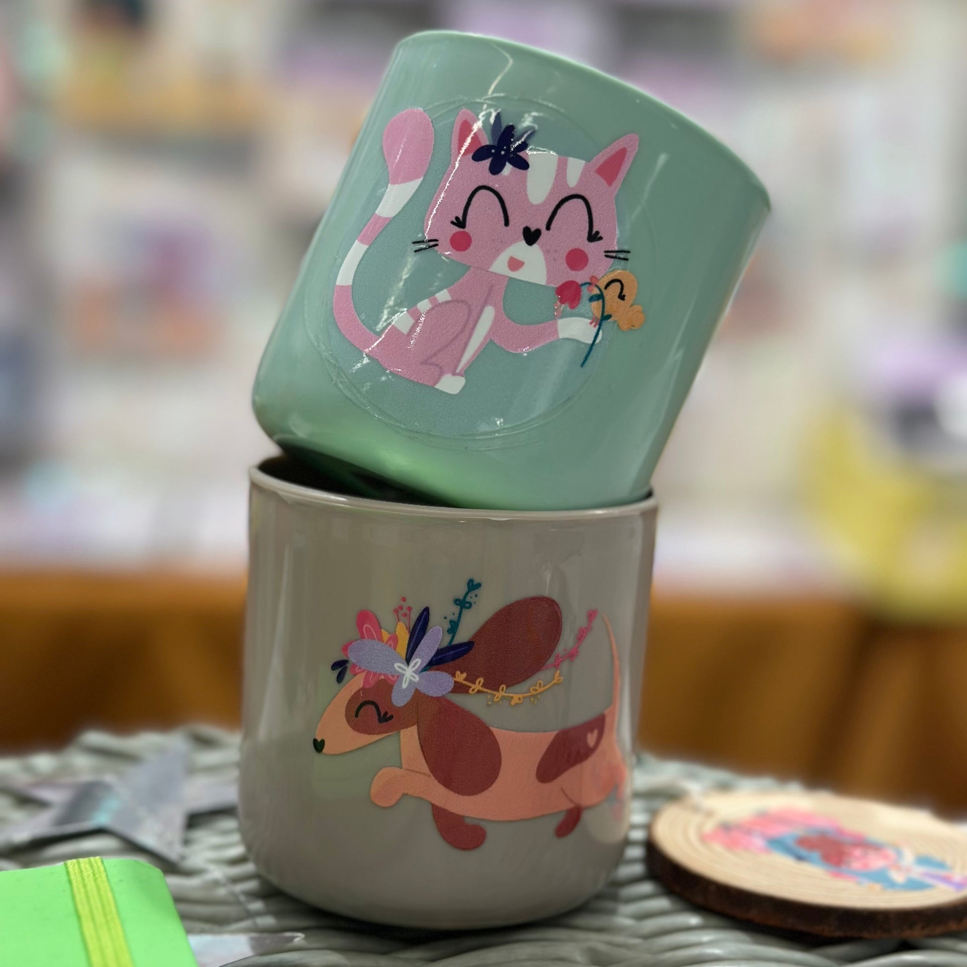 Pegatina UV DTF super resistente en soportes rígidos. Puedes personalizar libretas, carcasas de móvil, maderas, botellas y vasos de plástico o cristal, tuppers, cajas de cartón, macetas... incluso pega bien en telas de encuadernar.