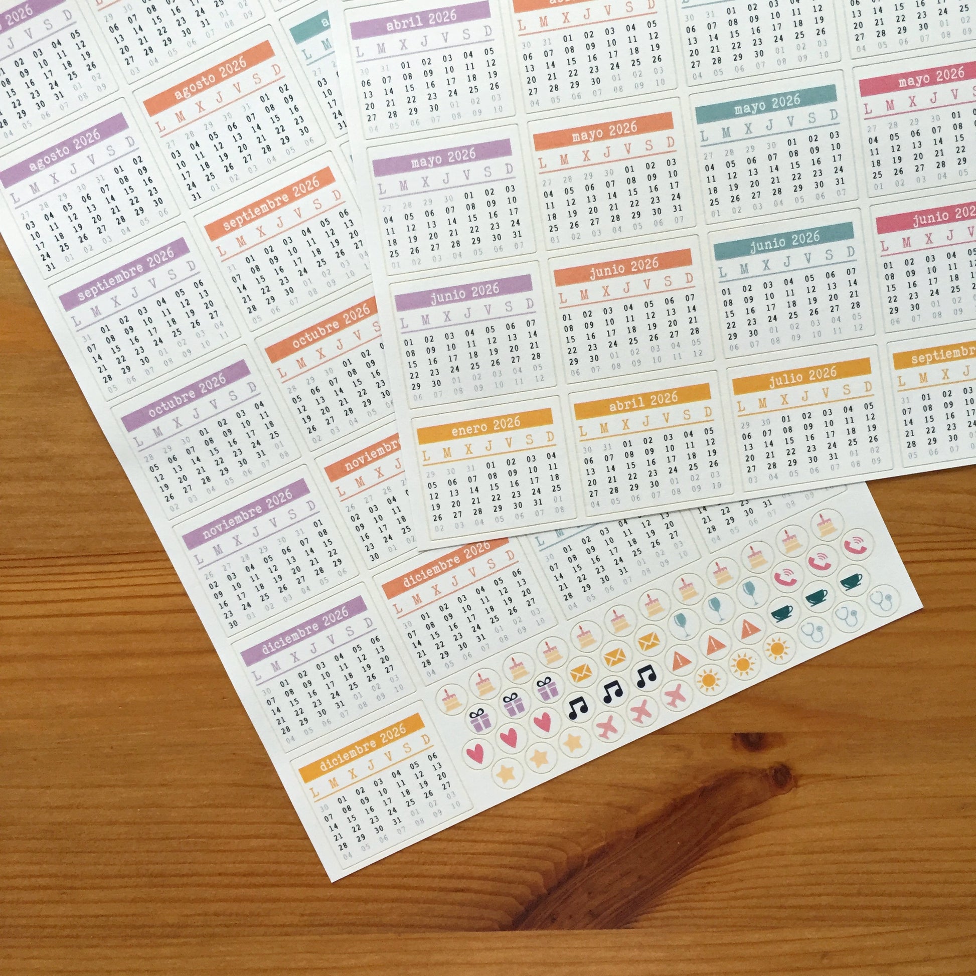 Este pack contiene 2 páginas adhesivas tamaño dinA5 (medio folio) con todos los meses de 2026 en pequeño para que lo pegues en un lado de tu hoja del planificador y puedas señalar la semana en la que estás.